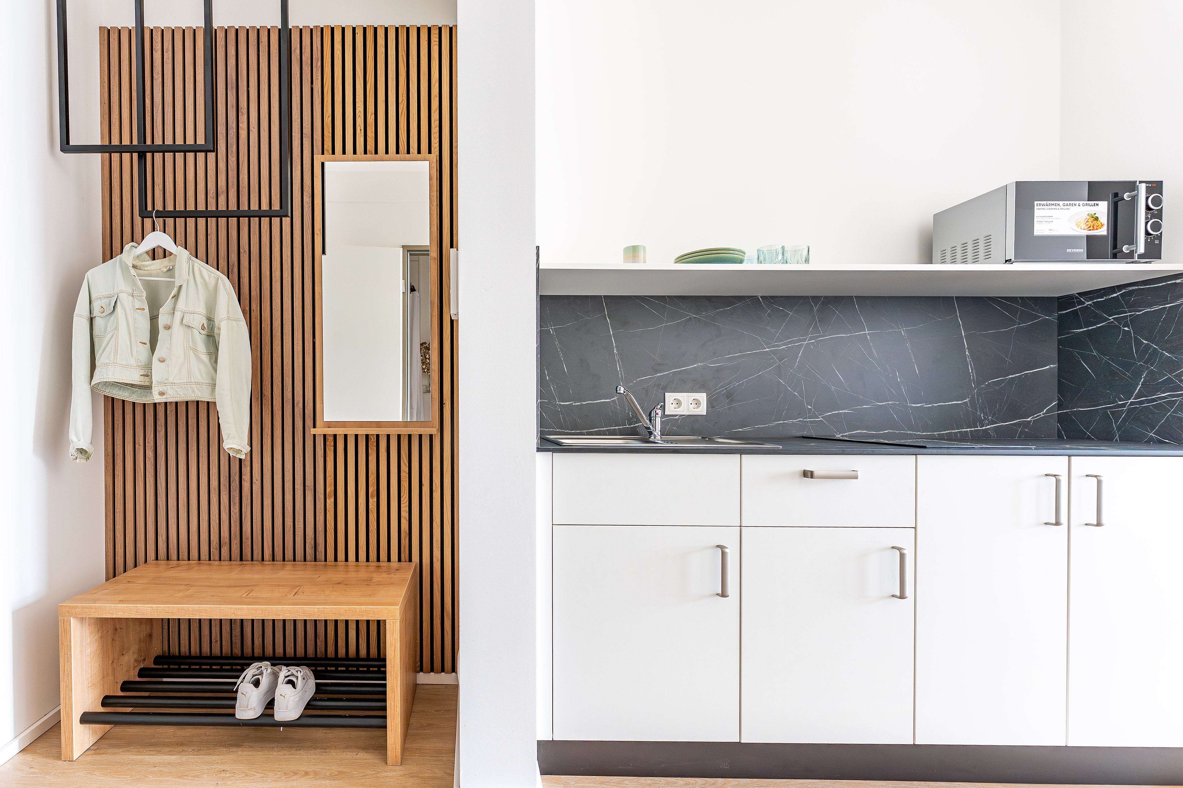 For the student dormitory at the Persiluhr in Straubing, which will offer 68 fully furnished apartments and 5 shared apartments in a modern living space in a central location starting October 2025, the family-run carpentry Seebauer GmbH, which has been in operation for 117 years, took over the majority of the interior construction. This includes the custom-made wardrobes made of oak slats and metal elements from our production, which perfectly complement the contemporary, sustainable, and high-quality ambiance.